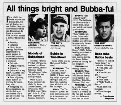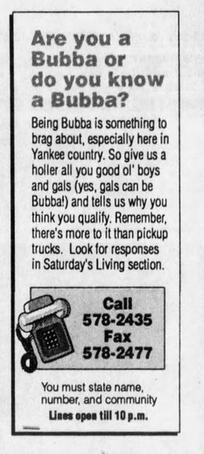 Back in the 1990’s when Clinton was in the race for the White House, he was given the nickname Bubba. Newspaper articles from all over the United States reported on this during his campaigns. Don Imus from WFAN started referring to him as “Bubba” and it took off from there. Many people did not see him as a “Bubba” and commented on this in the papers. His qualifications did not meet the definition reported by some: He went to Oxford and Yale, married a feminist, did not have the hair, and he did not wear his cap to the side. And Bubba’s don’t play the saxophone. And Bubba’s have common sense, and if a true Bubba lies, you are not spoken to again.