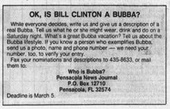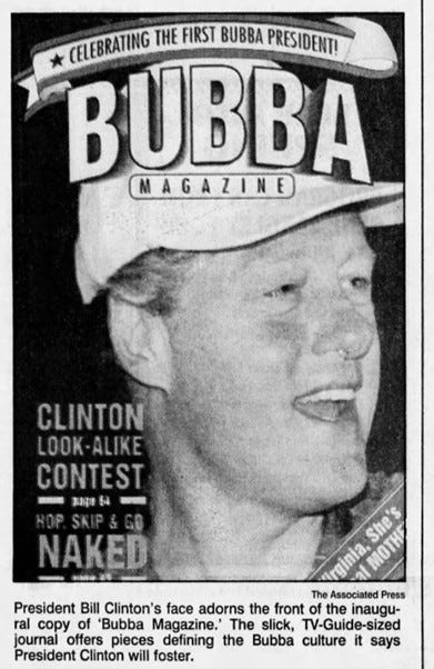 In New York a pocket-sized quarterly magazine was published by Allison Magazines. The first issue was in February 1993, and the name of the magazine – Bubba – and the focus: celebrated and satirized Bill Clinton “Bubba” image as he became president. It talked about his home state Arkansas and his lifestyle. But the magazine was short-lived.